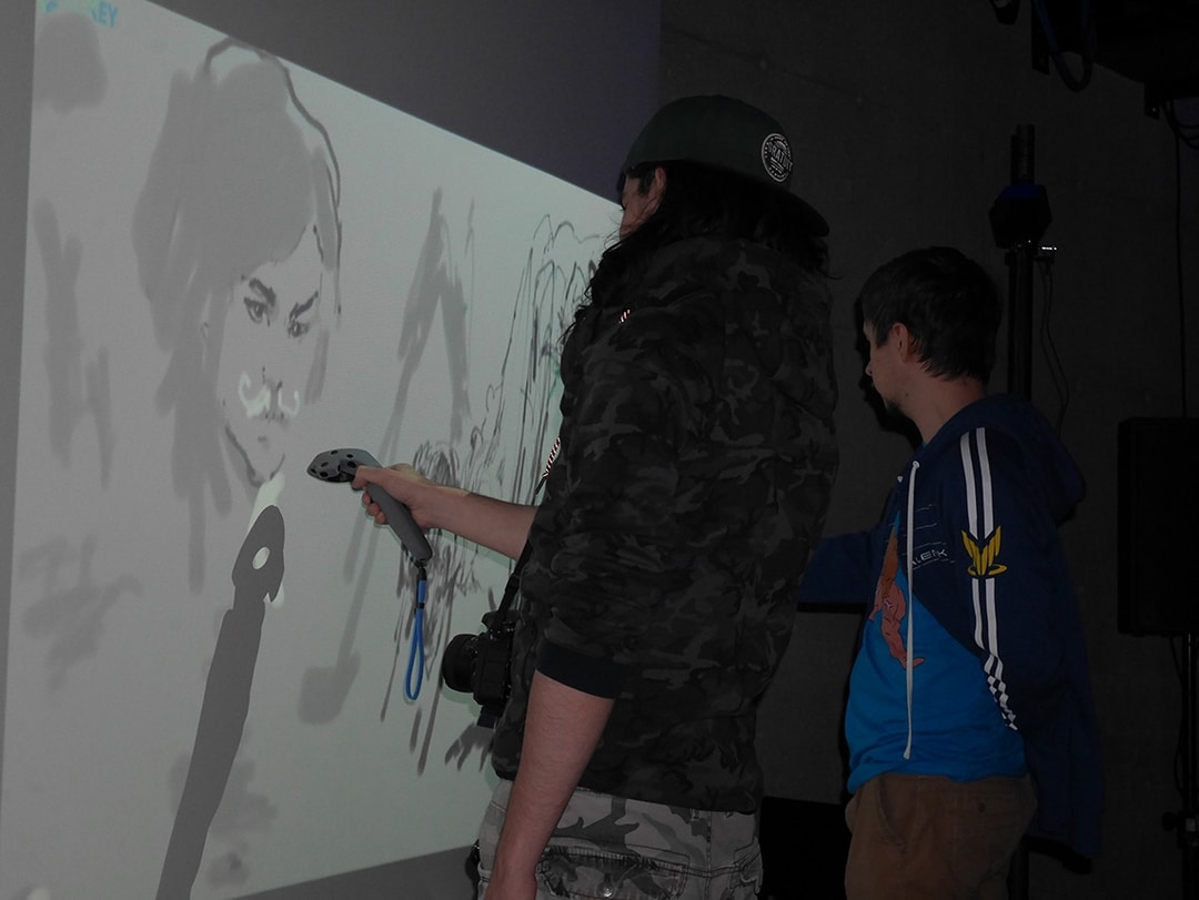 By manipulating controllers, users have virtual paint brushes in their hands. They can then choose a color of their choice by dipping their brush into one of the three virtual paint buckets available. Then, by approaching the controllers near the wall, they can create a fresco out of light.